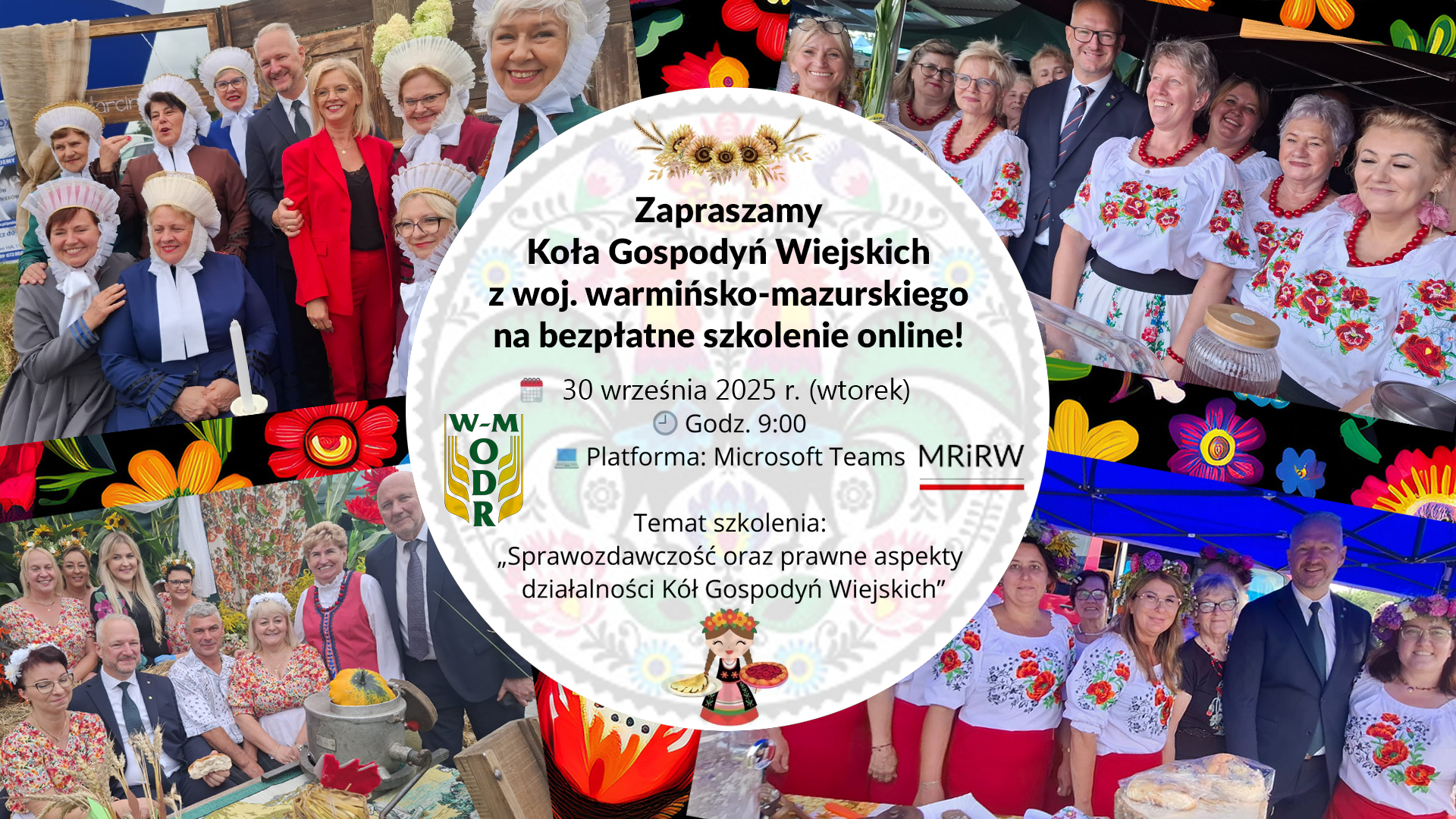 i Mazur do udziału w bezpłatnym szkoleniu praktycznym online pt. „Sprawozdawczość oraz prawne aspekty działalności Kół Gospodyń Wiejskich”,