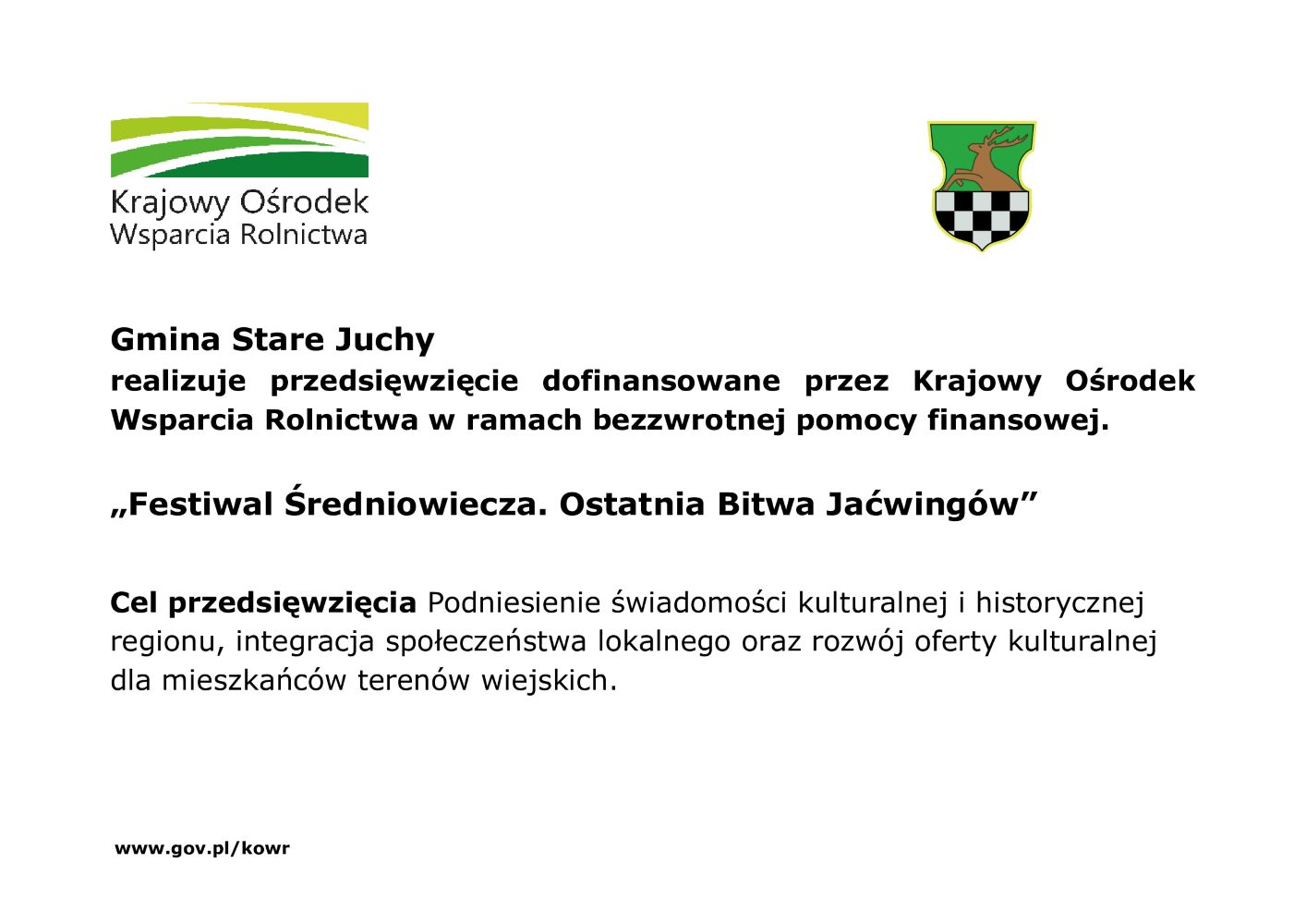 Gmina Stare Juchy realizuje przedsięwzięcie dofinansowane przez Krajowy Ośrodek Wsparcia Rolnictwa w ramach bezzwrotnej pomocy finansowej.