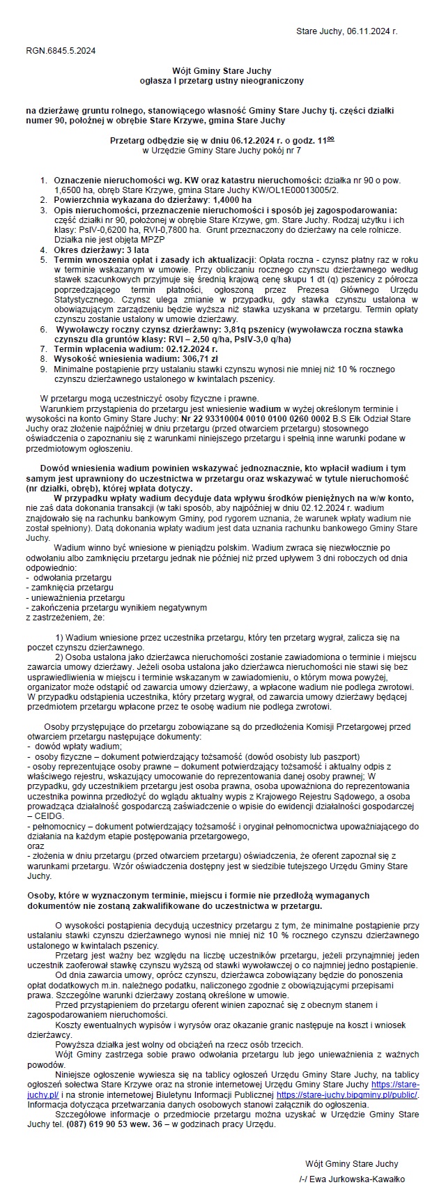 Ogłoszenie o I przetargu ustnym nieograniczonym na dzierżawę cz. dz. nr 90, obręb Stare Krzywe