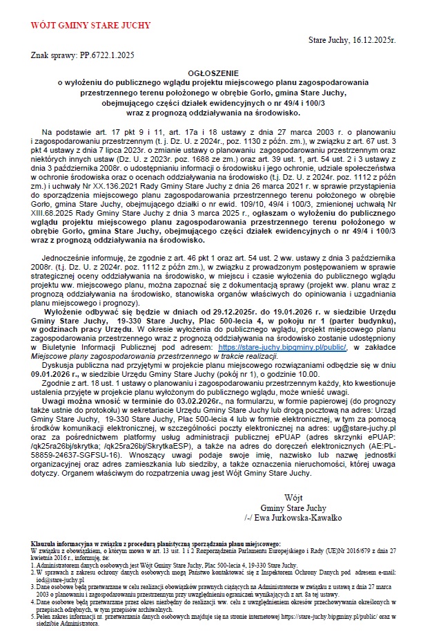 OGŁOSZENIE WÓJTA GMINY STARE JUCHY ZNAK SPRAWY: PP.6722.1.2025